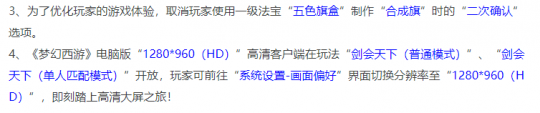 第2条是新增加飞燕女手办,喜欢手办的玩家可以入手一波。第3和第4条都是优化类型,五色旗盒取消二次确认操作,大分辨率模式全服开放。
