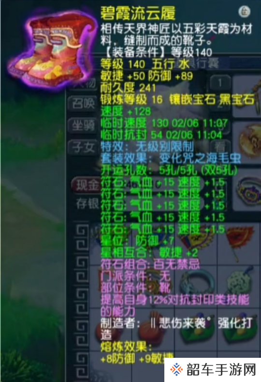 基础防御97,基础敏捷59,镶嵌16锻黑宝石的140级无级别鞋子。