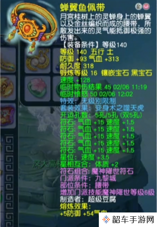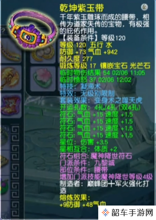基础防御82,基础气血310,镶嵌17锻光芒石,附加特技凝滞术的120级无级别腰带。