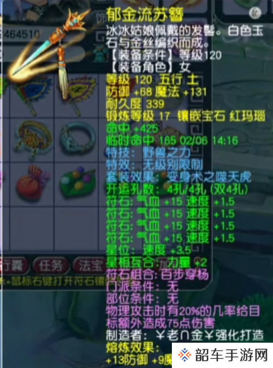基础防御81,镶嵌17锻红玛瑙,附加特技野兽之力的120级无级别发钗。