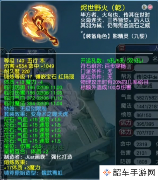 蔡少侠的右手武器为140级无级别五丁开山,镶嵌16锻太阳石,九黎使用时综合伤害为578.8。