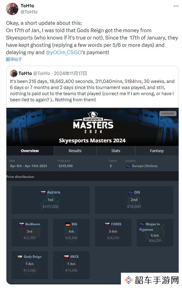 在未收到这项于2024年4月就已经结束的赛事奖金后,ToH1o再次在社交平台上披露了更多细节。据ToH1o称,Gods Reign战队一直在拖延支付他和yoom的奖金。