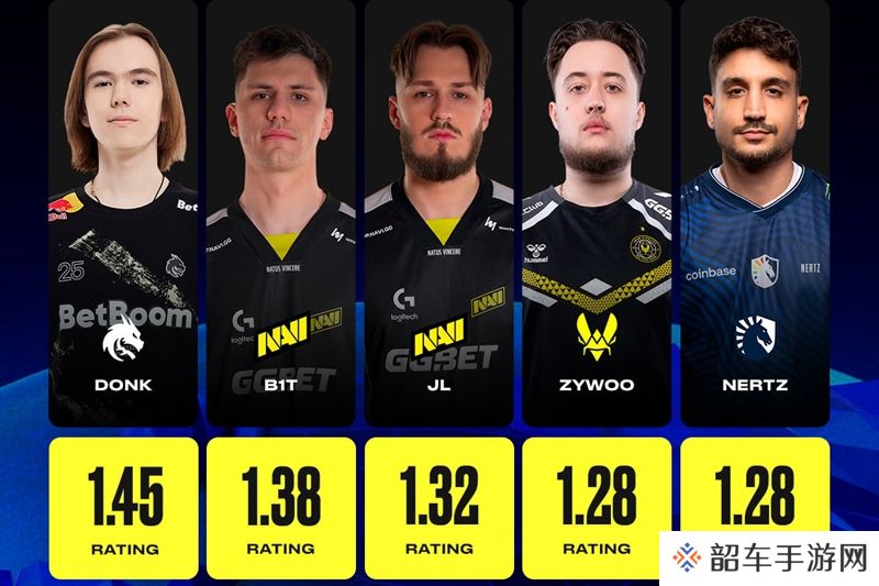 NAVI的b1t和jL分别以1.38和1.32的Rating位列第二和第三,而去年TOP3的ZywOo则以微弱劣势排名第四,刚刚转会至Liquid的NertZ则紧随其后,位列第五。
