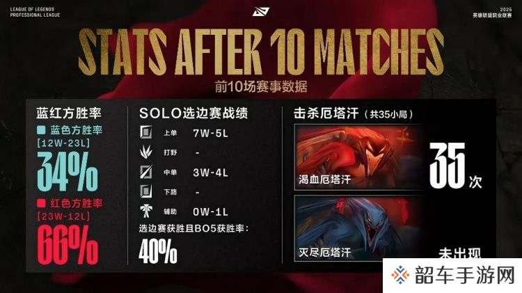 直播吧1月22日讯 2025LPL第一赛段WE vs LGD的比赛即将开始,官方直播间给出第一赛段前十场比赛数据,渴血厄塔汗100%出现。