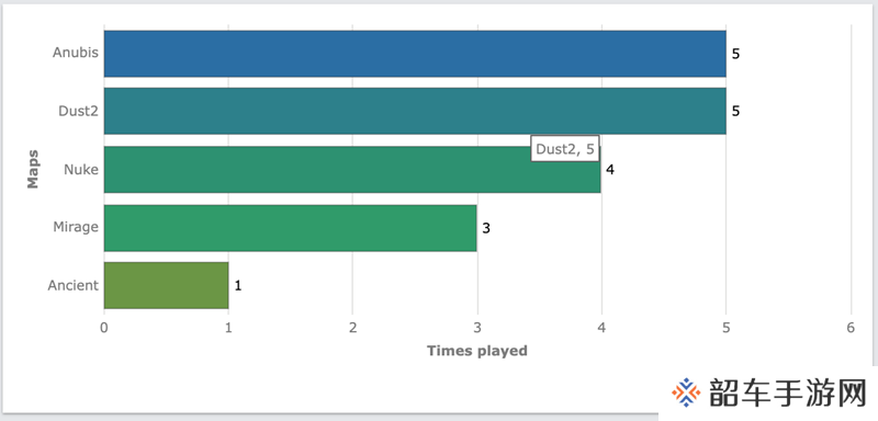 线下赛阶段,Anubis和Dust2登场次数最多,均出场5次,而Ancient仅在该阶段出场一次。